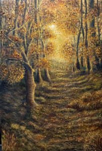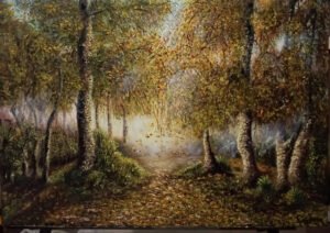 Güneşin Süzüldüğü Yaz: Yağlı boya tekniğiyle yapılan bu eser; yaz gününün sakinliğini, sarı ve açık yeşil ağaçlar arasından süzülen güneş ışıklarıyla yansıtarak izleyicide huzur ve dinginlik hissi uyandırır.v